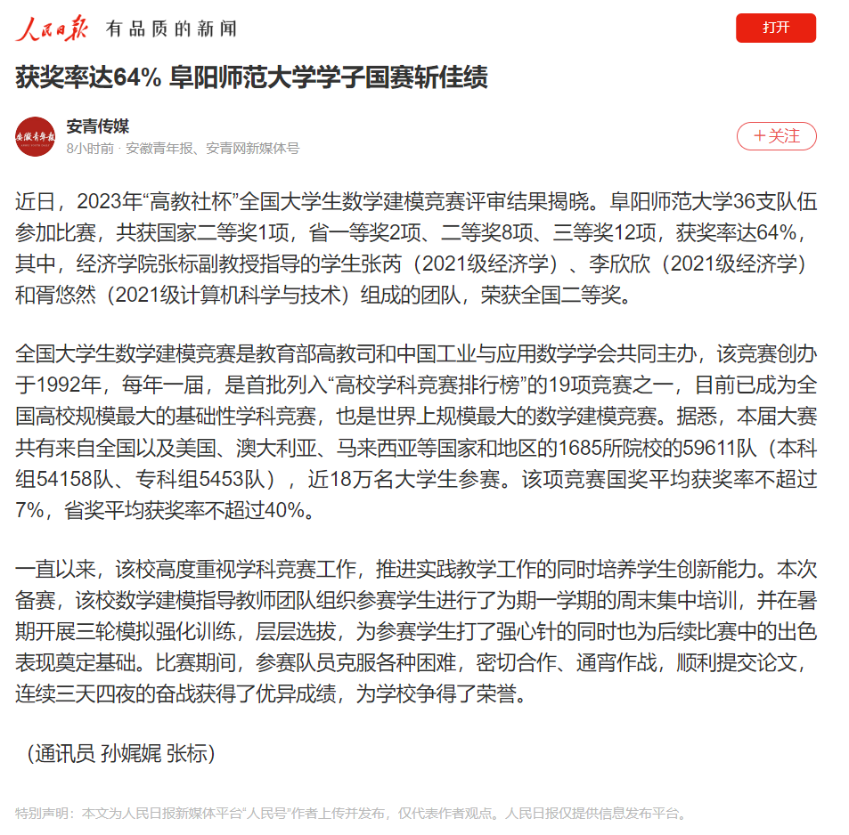 12月27日,人民日报客户端报道:获奖率达64% 阜阳师范大学学子国赛斩佳绩。文章地址:https://wap.peopleapp.com/article/rmh39293250/rmh39293250