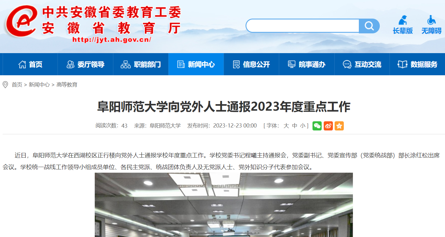 安徽教育网报道:阜阳师范大学向党外人士通报2023年度重点工作