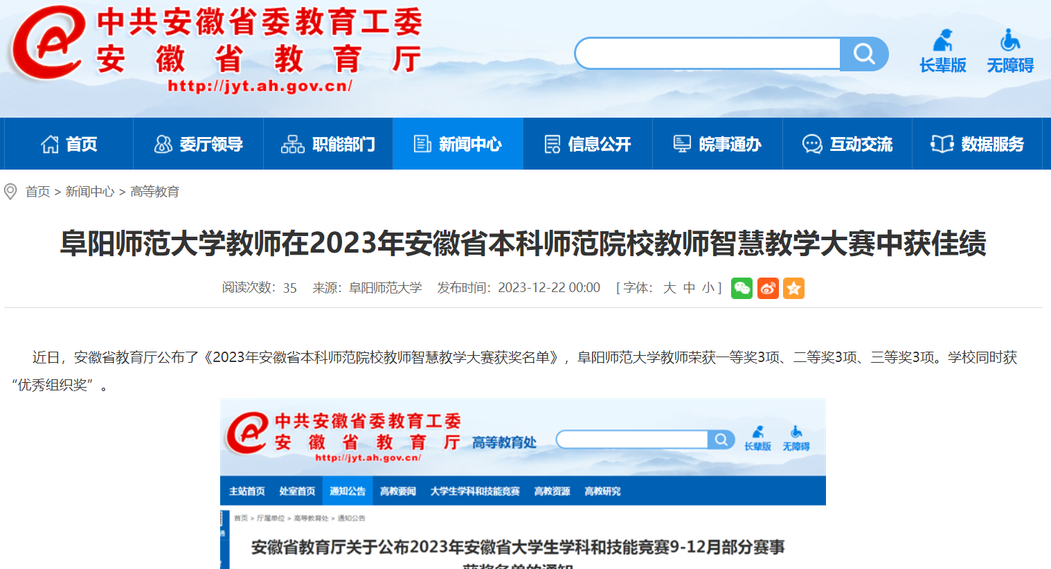 12月22日,安徽教育网报道:阜阳师范大学教师在2023年安徽省本科师范院校教师智慧教学大赛中获佳绩。文章地址:http://jyt.ah.gov.cn/xwzx/gdjy/40685914.html