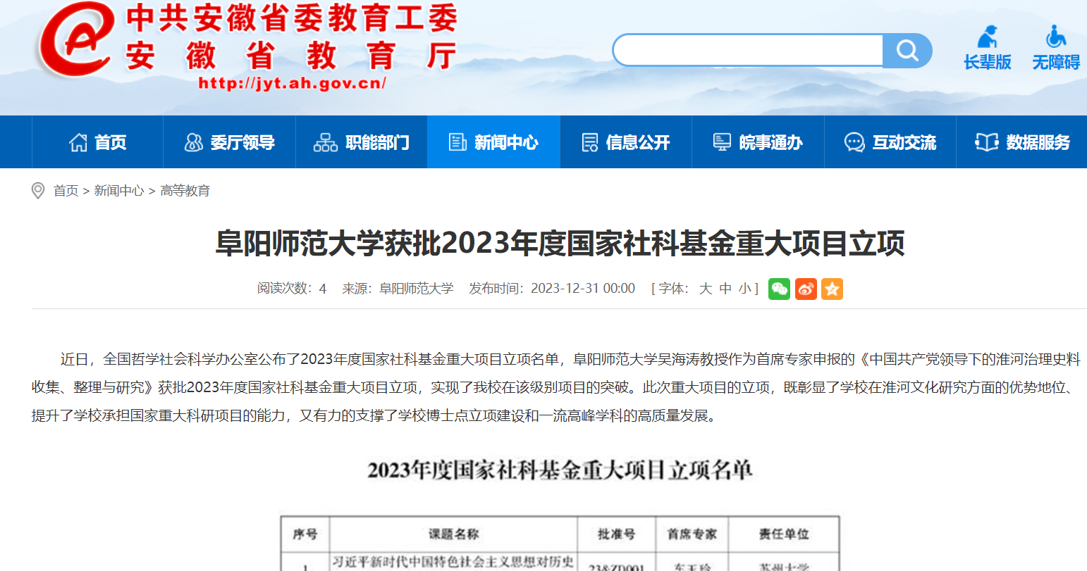 12月31日,安徽教育网报道:阜阳师范大学获批2023年度国家社科基金重大项目立项。文章地址: