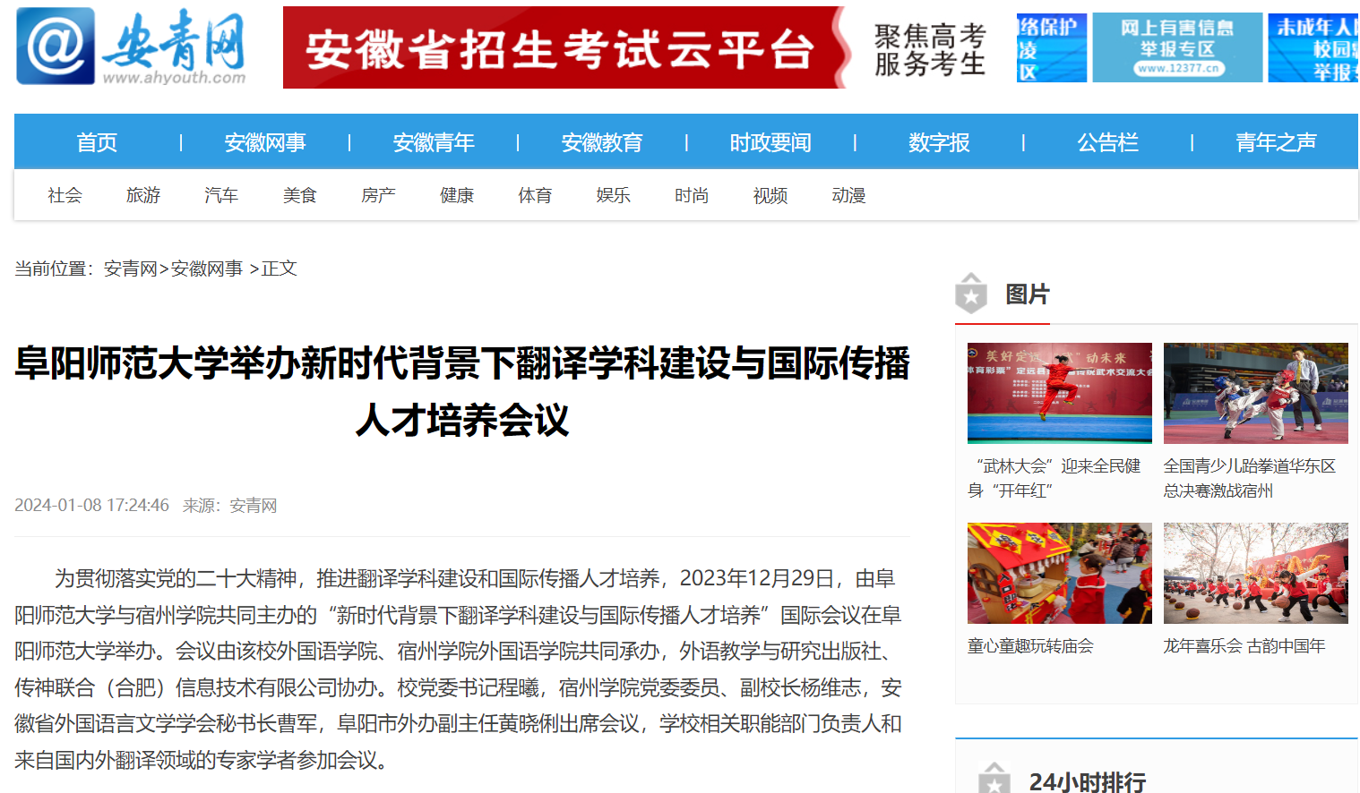 1月08日,安青网报道:阜阳师范大学举办新时代背景下翻译学科建设与国际传播人才培养会议。文章地址:https://www.ahyouth.com/news/20240108/1722314.shtml
