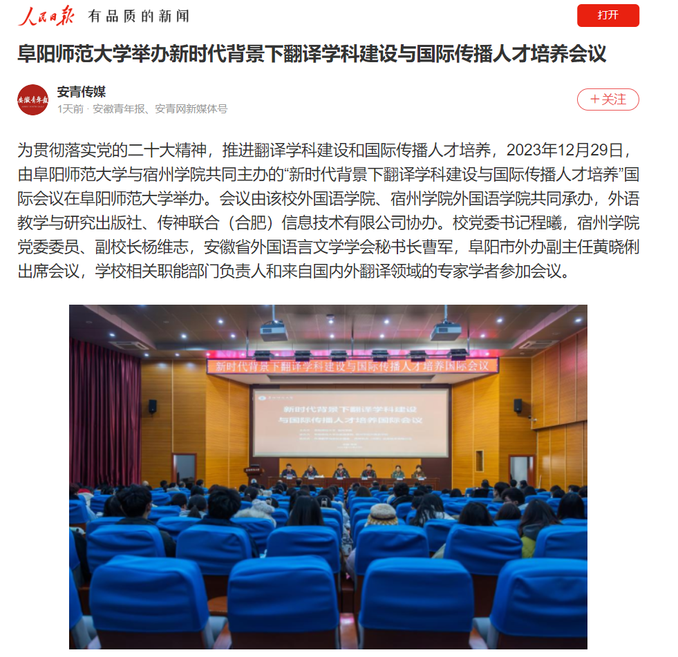 1月09日,人民日报客户端报道:阜阳师范大学举办新时代背景下翻译学科建设与国际传播人才培养会议。文章地址:https://wap.peopleapp.com/article/rmh39449180/rmh39449180