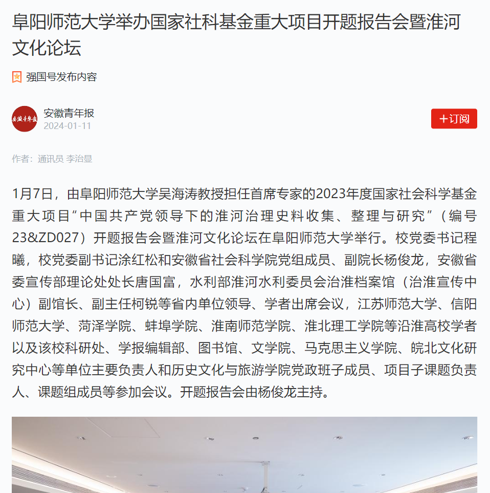 1月11日,“学习强国”安徽青年报平台报道:阜阳师范大学举办国家社科基金重大项目开题报告会暨淮河文化论坛。文章地址:https://article.xuexi.cn/articles/index.html?art_id=1751421018808867099&source=share&study_style_id=feeds_opaque&reco_id=1027c7bba675c0a822a7000b&share_to=wx_single&study_share_enable=1&study_comment_disable=0&ptype=0&item_id=1751421018808867099