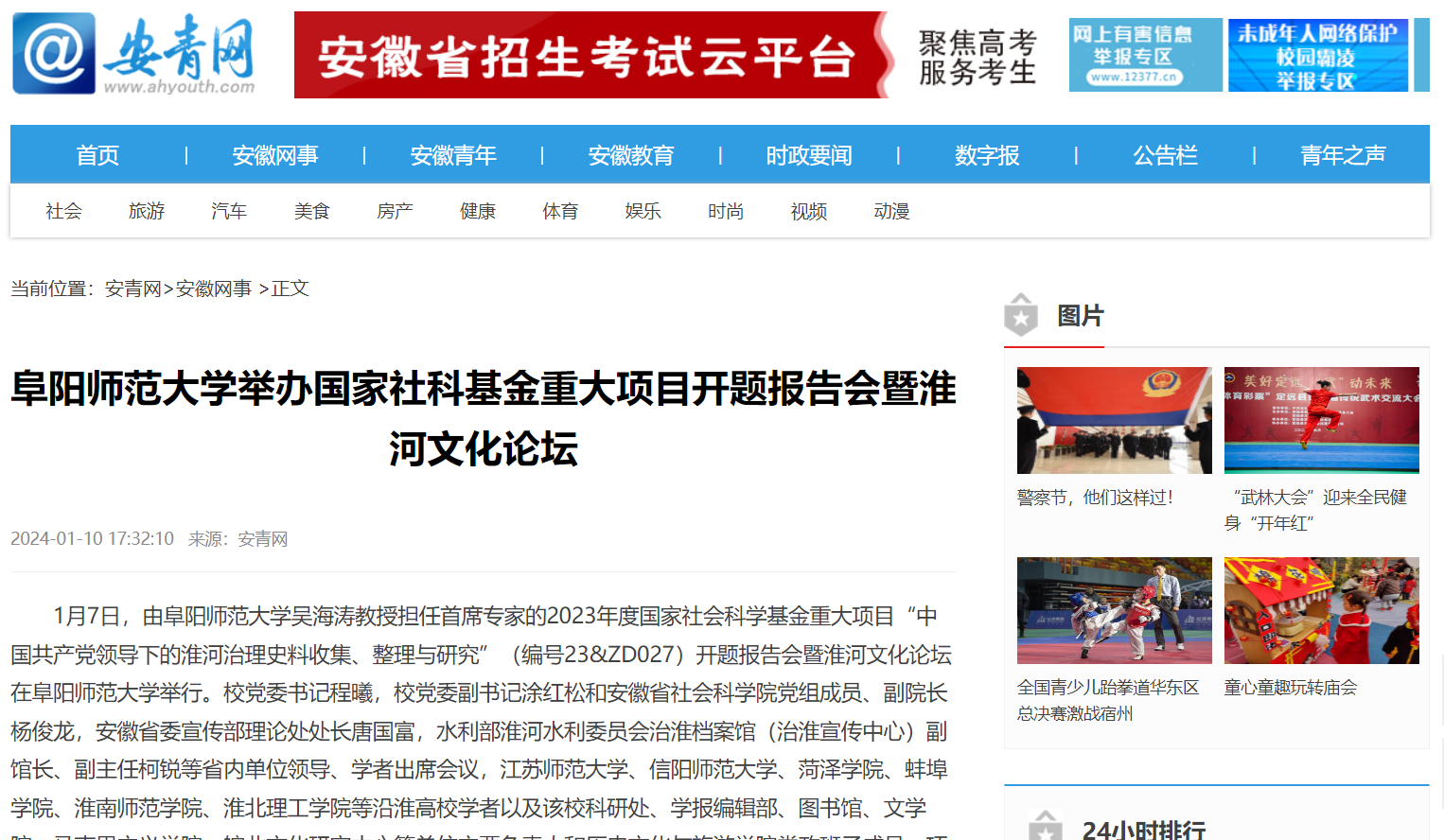 1月10日,安青网报道:阜阳师范大学举办国家社科基金重大项目开题报告会暨淮河文化论坛。文章地址: