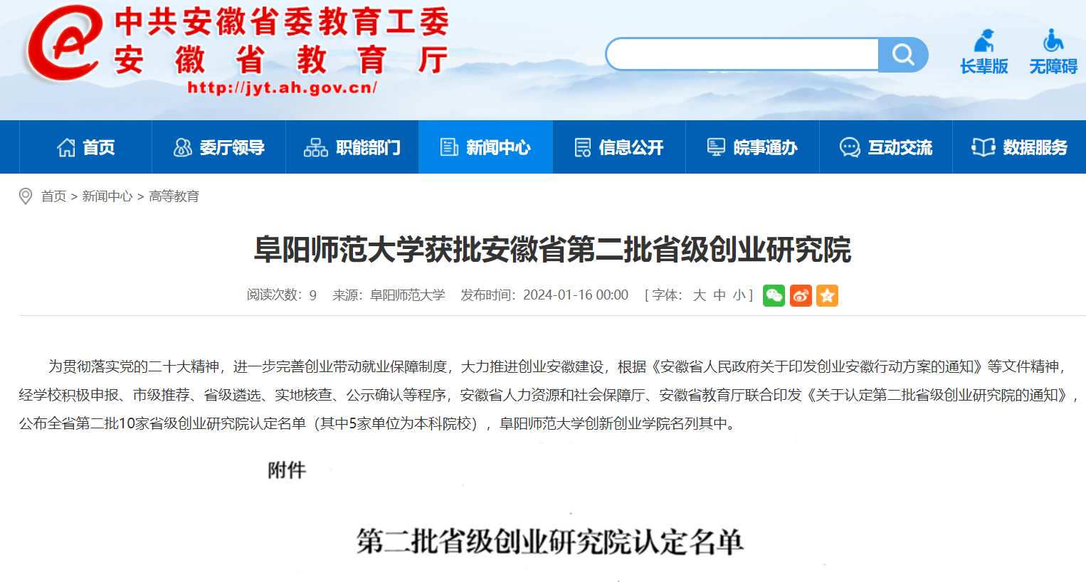 安徽教育网报道:阜阳师范大学获批安徽省第二批省级创业研究院