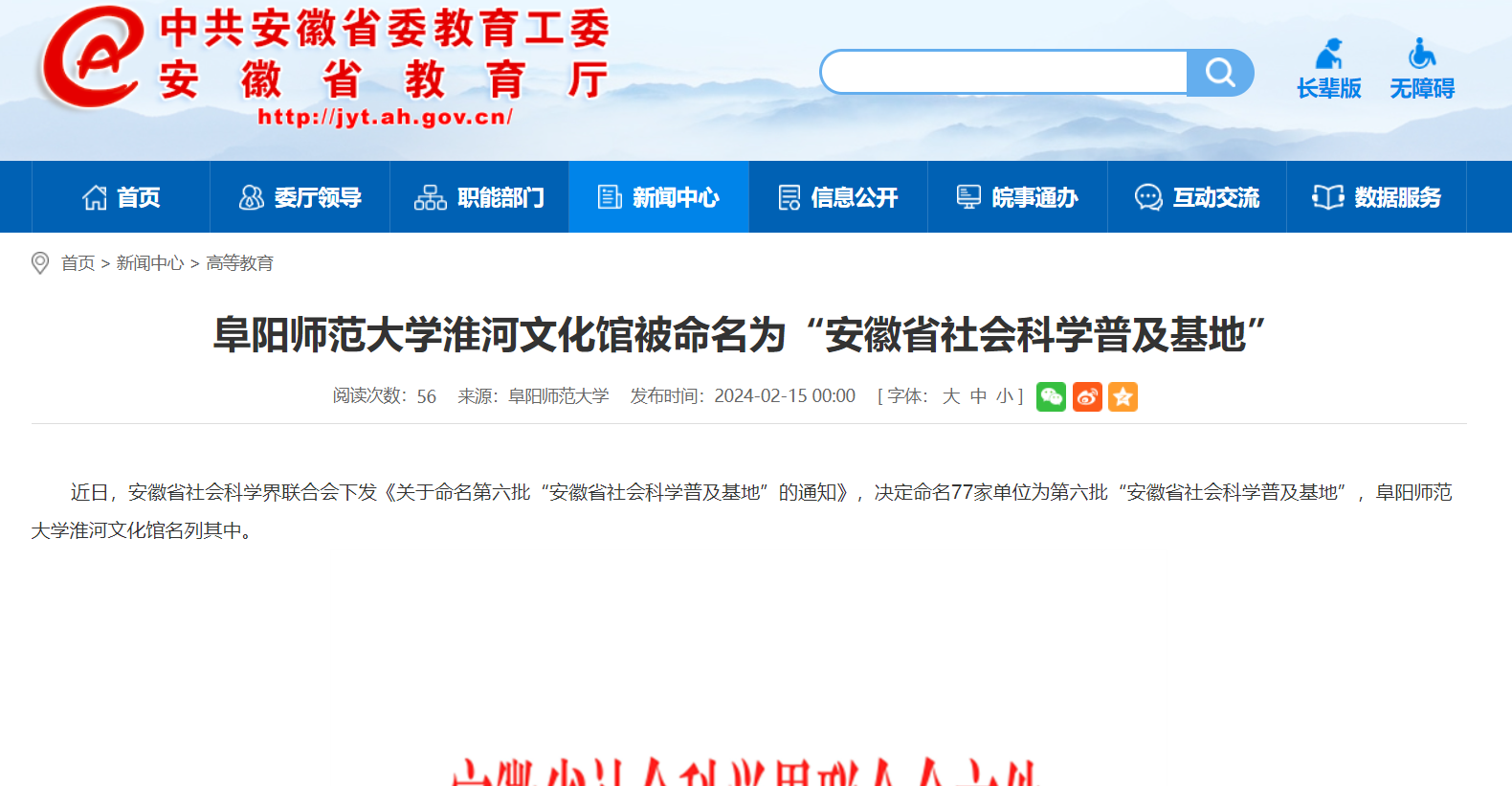 2月15日,安徽教育网报道:阜阳师范大学淮河文化馆被命名为“安徽省社会科学普及基地”。文章地址: