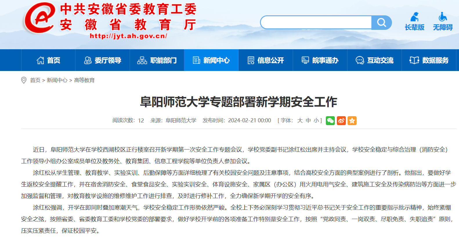 2月21日,安徽教育网报道:阜阳师范大学专题部署新学期安全工作。文章地址: