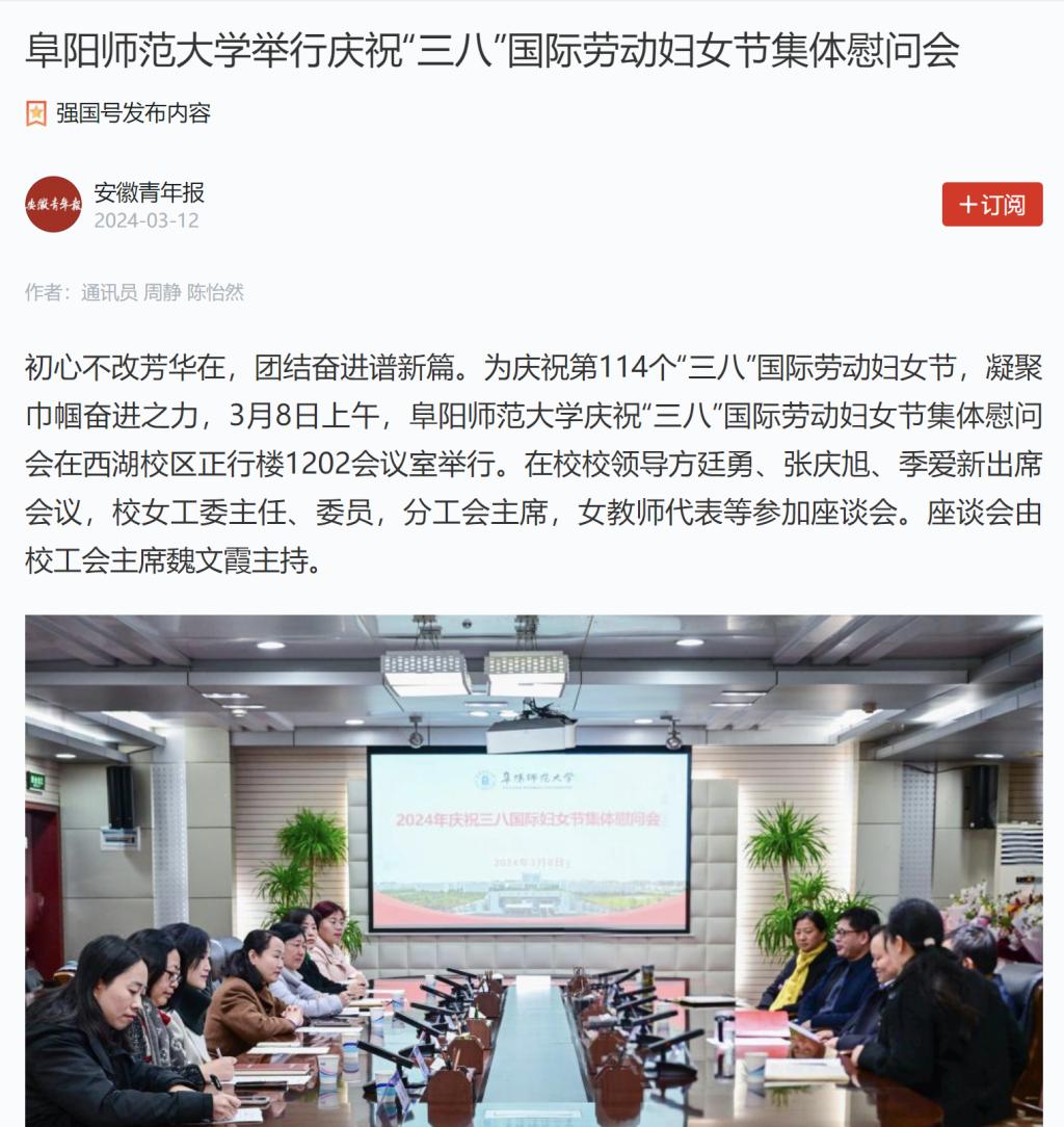 3月12日,“学习强国”安徽青年报平台报道:阜阳师范大学举行庆祝“三八”国际劳动妇女节集体慰问会。文章地址:https://article.xuexi.cn/articles/index.html?art_id=2945457714536948814&source=share&study_style_id=feeds_opaque&reco_id=1029048952ecc0a88471000c&share_to=wx_single&study_share_enable=1&study_comment_disable=0&ptype=0&item_id=2945457714536948814