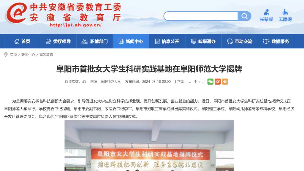 安徽教育网报道:阜阳市首批女大学生科研实践基地在阜阳师范大学揭牌