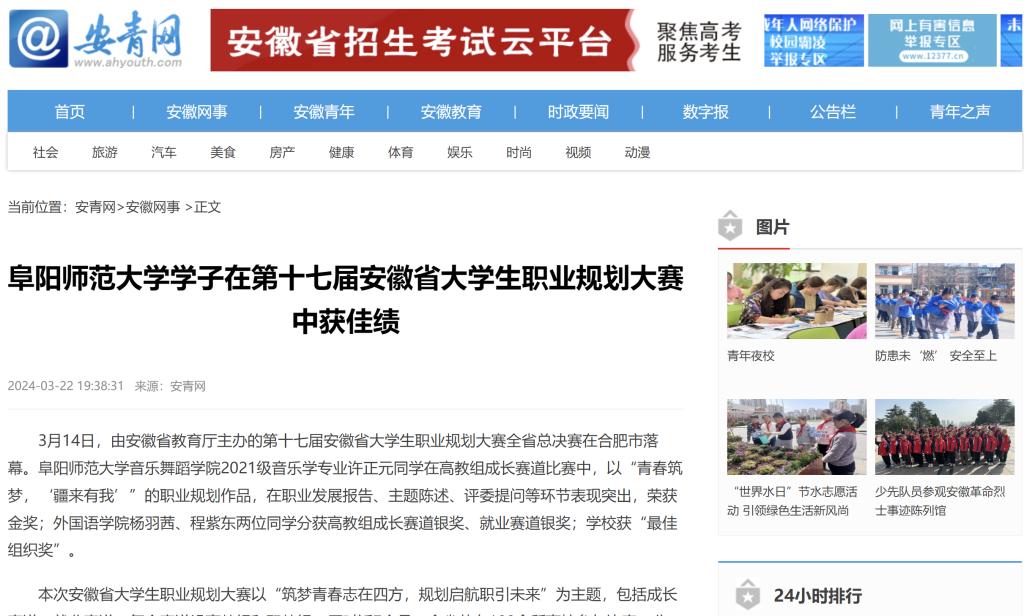 3月22日,安青网报道:阜阳师范大学学子在第十七届安徽省大学生职业规划大赛中获佳绩。文章地址: