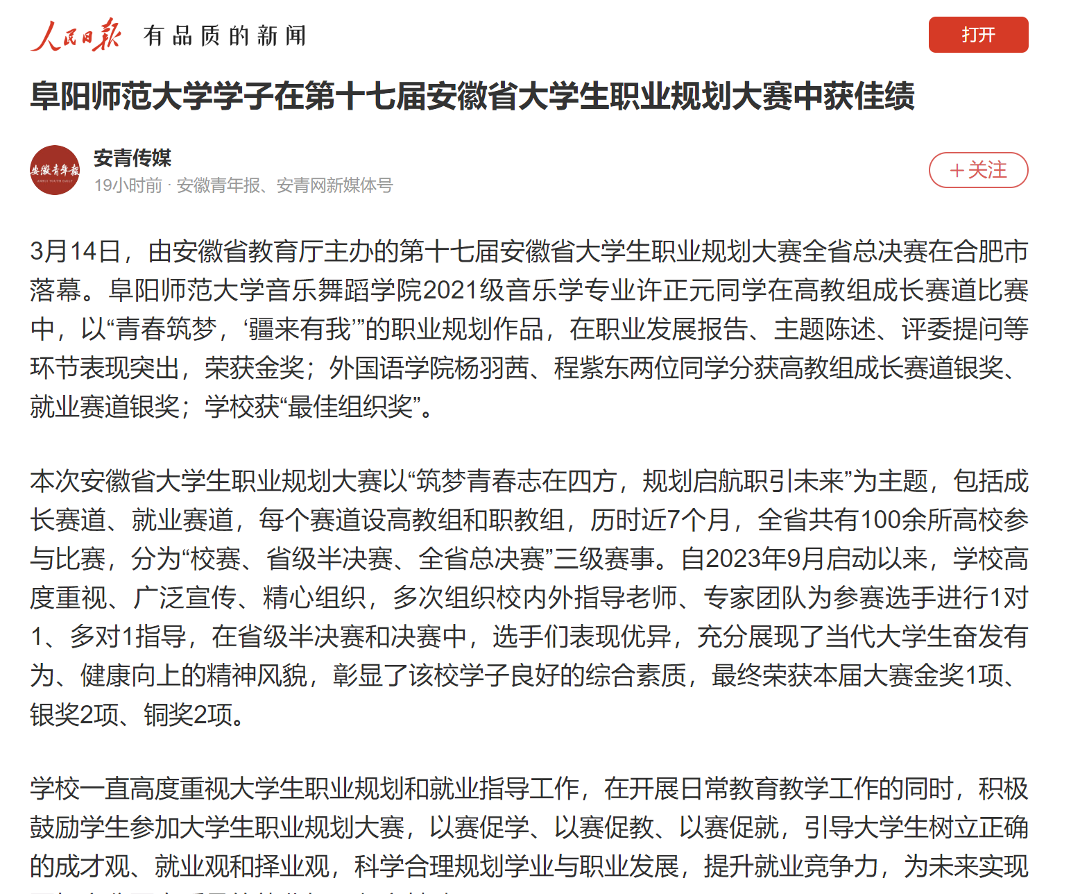 3月25日,人民日报客户端报道:阜阳师范大学学子在第十七届安徽省大学生职业规划大赛中获佳绩。文章地址:https://wap.peopleapp.com/article/rmh40418297/rmh40418297
