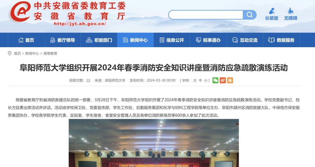 3月30日,安徽教育网报道:阜阳师范大学组织开展2024年春季消防安全知识讲座暨消防应急疏散演练活动。文章地址:http://jyt.ah.gov.cn/xwzx/gdjy/40698496.html
