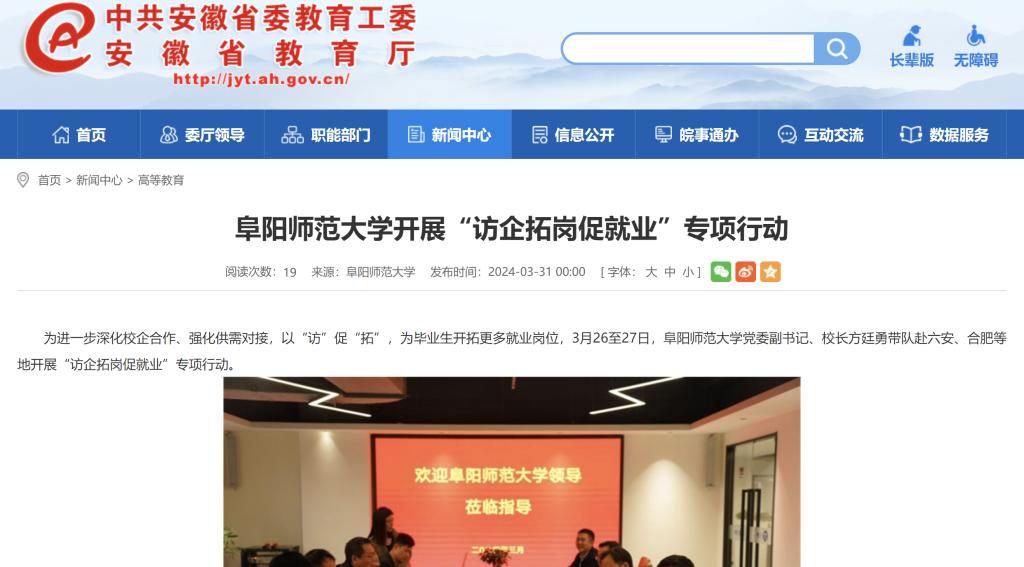安徽教育网报道:阜阳师范大学开展“访企拓岗促就业”专项行动