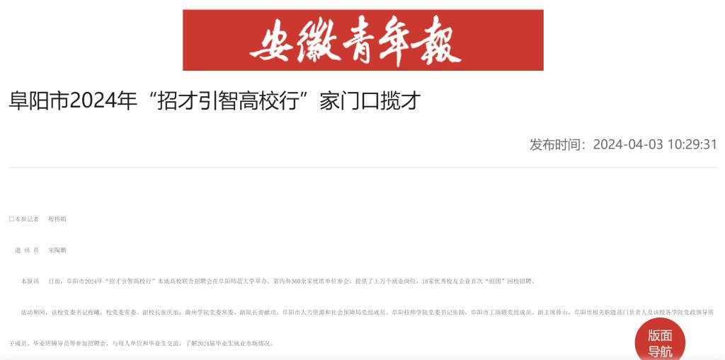 4月03日,安徽青年报平台报道:阜阳市2024年“招才引智高校行”家门口揽才。文章地址:http://epaper.ahyouth.com/paperdetails.php?CurrPeid=2334&CurrSid=22578&newsid=64771