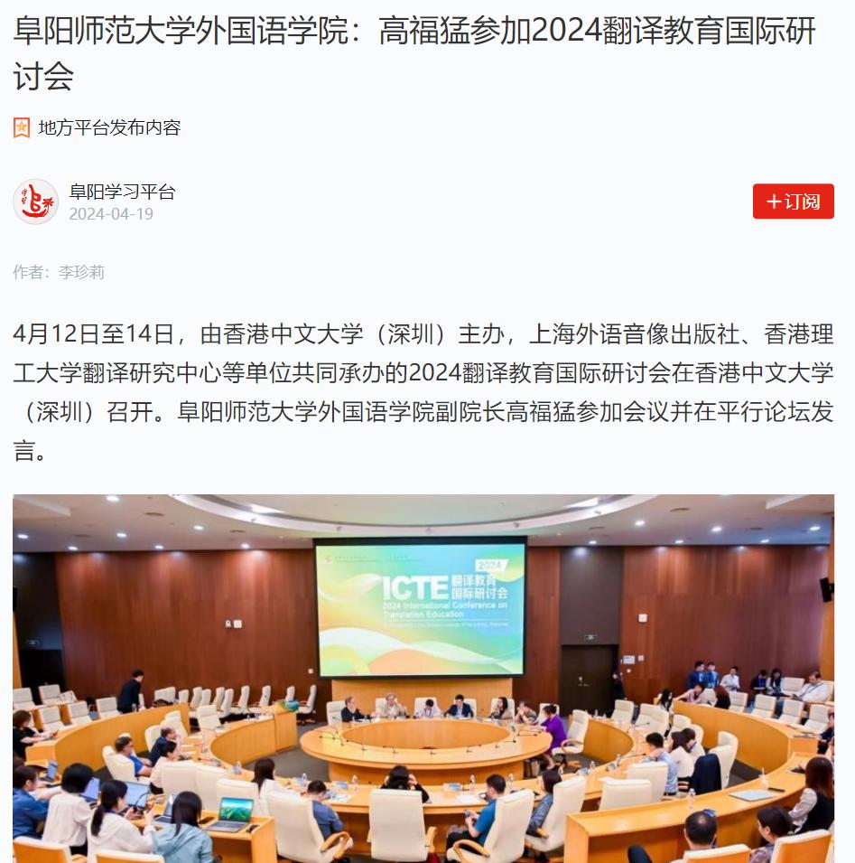 4月12日至14日,“学习强国”阜阳学习平台报道:阜阳师范大学外国语学院:高福猛参加2024翻译教育国际研讨会。文章地址:https://article.xuexi.cn/articles/index.html?art_id=12576058964176105363&item_id=12576058964176105363&cdn=https%3A%2F%2Fregion-anhui-resource&study_style_id=feeds_opaque&pid=&ptype=-1&source=share&share_to=wx_single