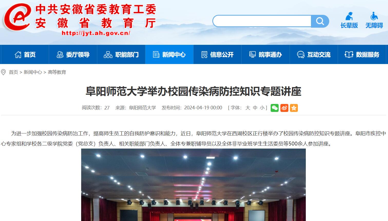 4月19日,安徽教育网报道:阜阳师范大学举办校园传染病防控知识专题讲座。文章地址: