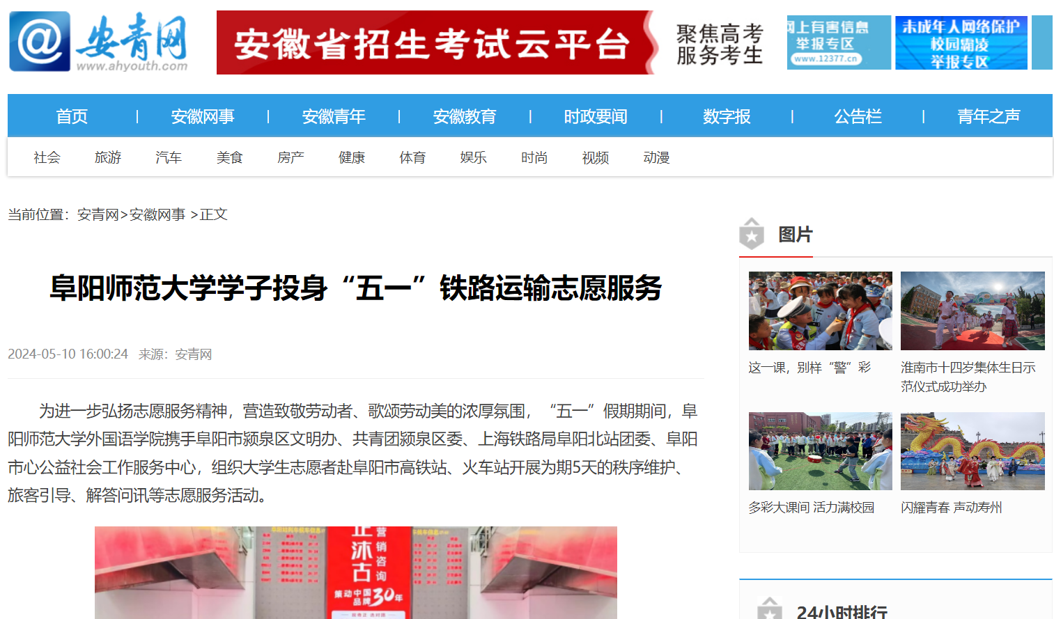 5月10日,安青网报道:阜阳师范大学学子投身“五一”铁路运输志愿服务。文章地址: