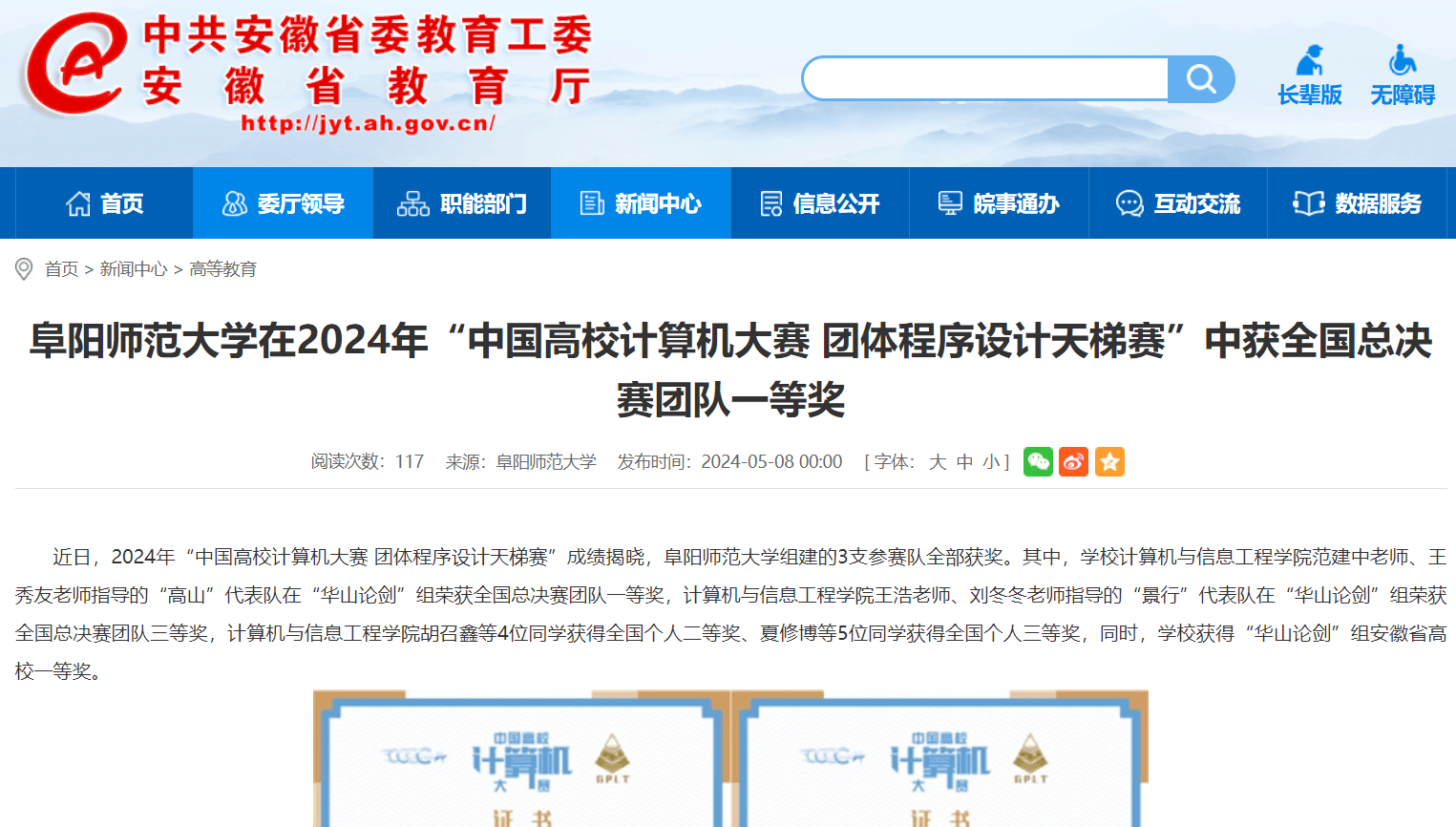 5月08日,安徽教育网报道:阜阳师范大学在2024年“中国高校计算机大赛 团体程序设计天梯赛”中获全国总决赛团队一等奖。文章地址:http://jyt.ah.gov.cn/xwzx/gdjy/40703862.html
