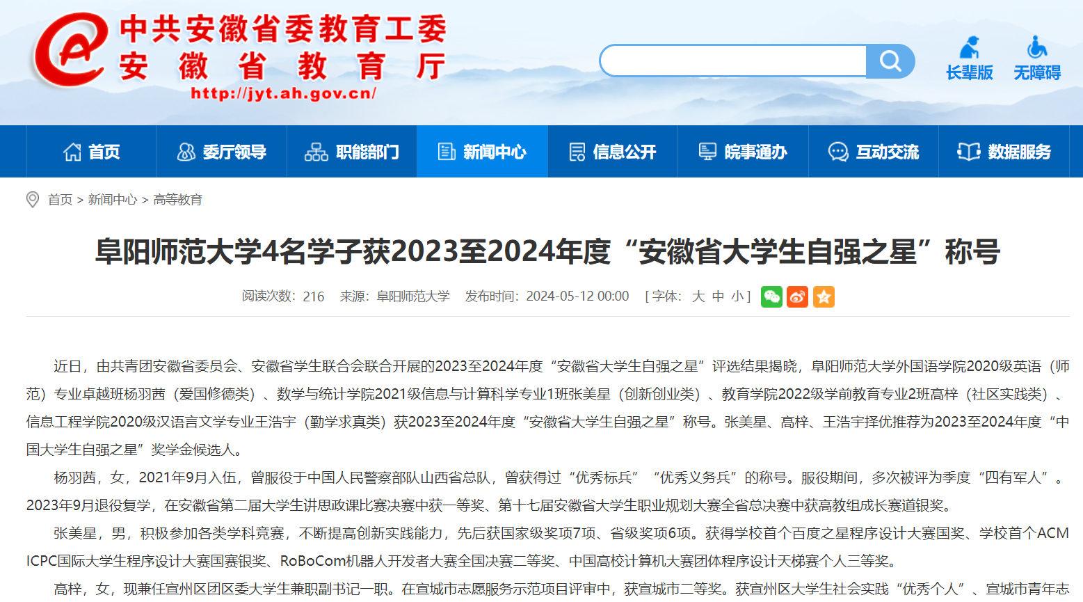 5月12日,安徽教育网报道:阜阳师范大学4名学子获2023至2024年度“安徽省大学生自强之星”称号。文章地址:http://jyt.ah.gov.cn/xwzx/gdjy/40704519.html