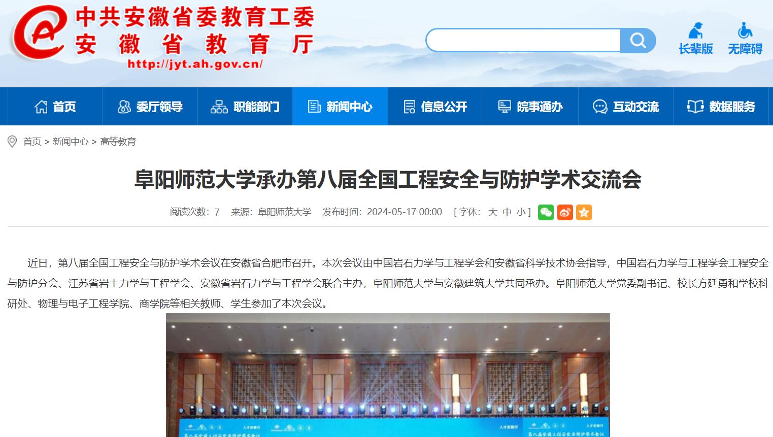 5月17日,安徽教育网报道:阜阳师范大学承办第八届全国工程安全与防护学术交流会。文章地址: