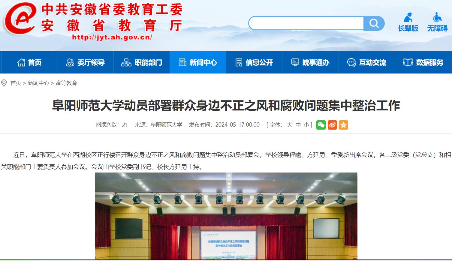 安徽教育网报道:阜阳师范大学动员部署群众身边不正之风和腐败问题集中整治工作