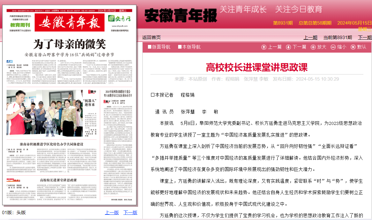 5月15日,安徽青年报报道:高校校长进课堂讲思政课。文章地址:http://epaper.ahyouth.com/paperdetails.php?CurrPeid=2349&CurrSid=22768&newsid=65293