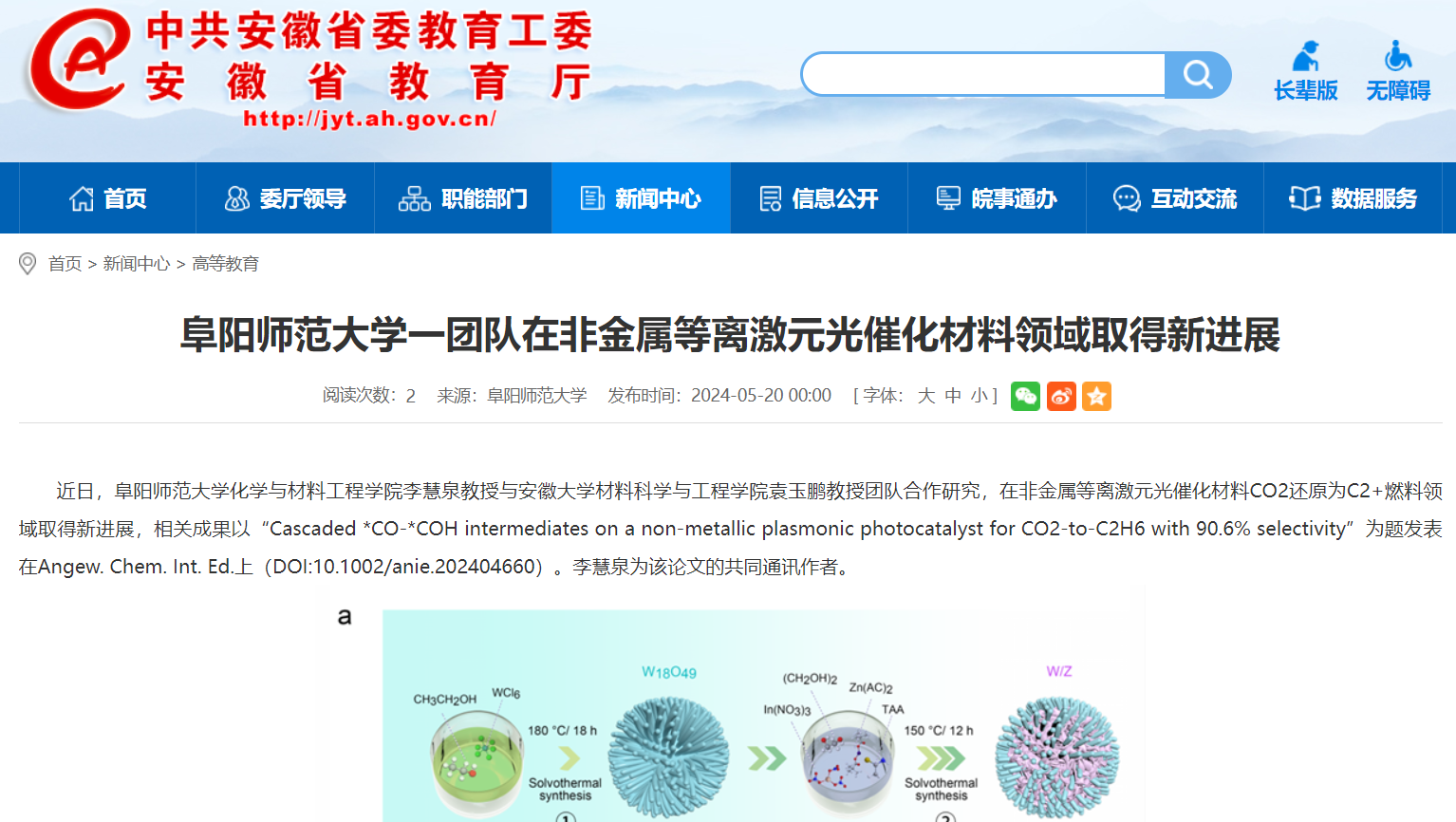 5月20日,安徽教育网报道:阜阳师范大学一团队在非金属等离激元光催化材料领域取得新进展。文章地址: