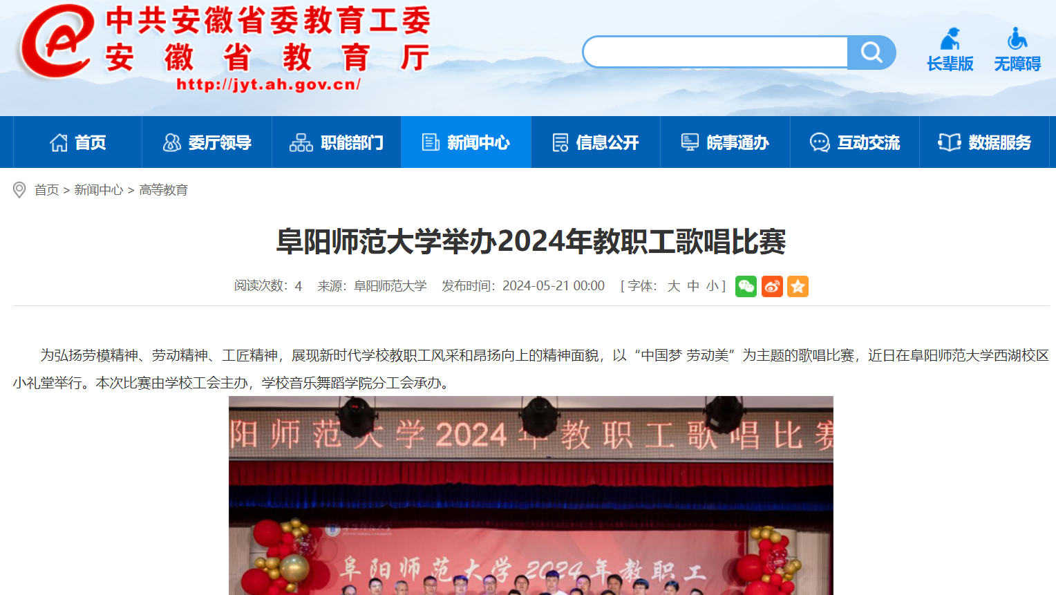 5月21日,安徽教育网报道:阜阳师范大学举办2024年教职工歌唱比赛。文章地址: