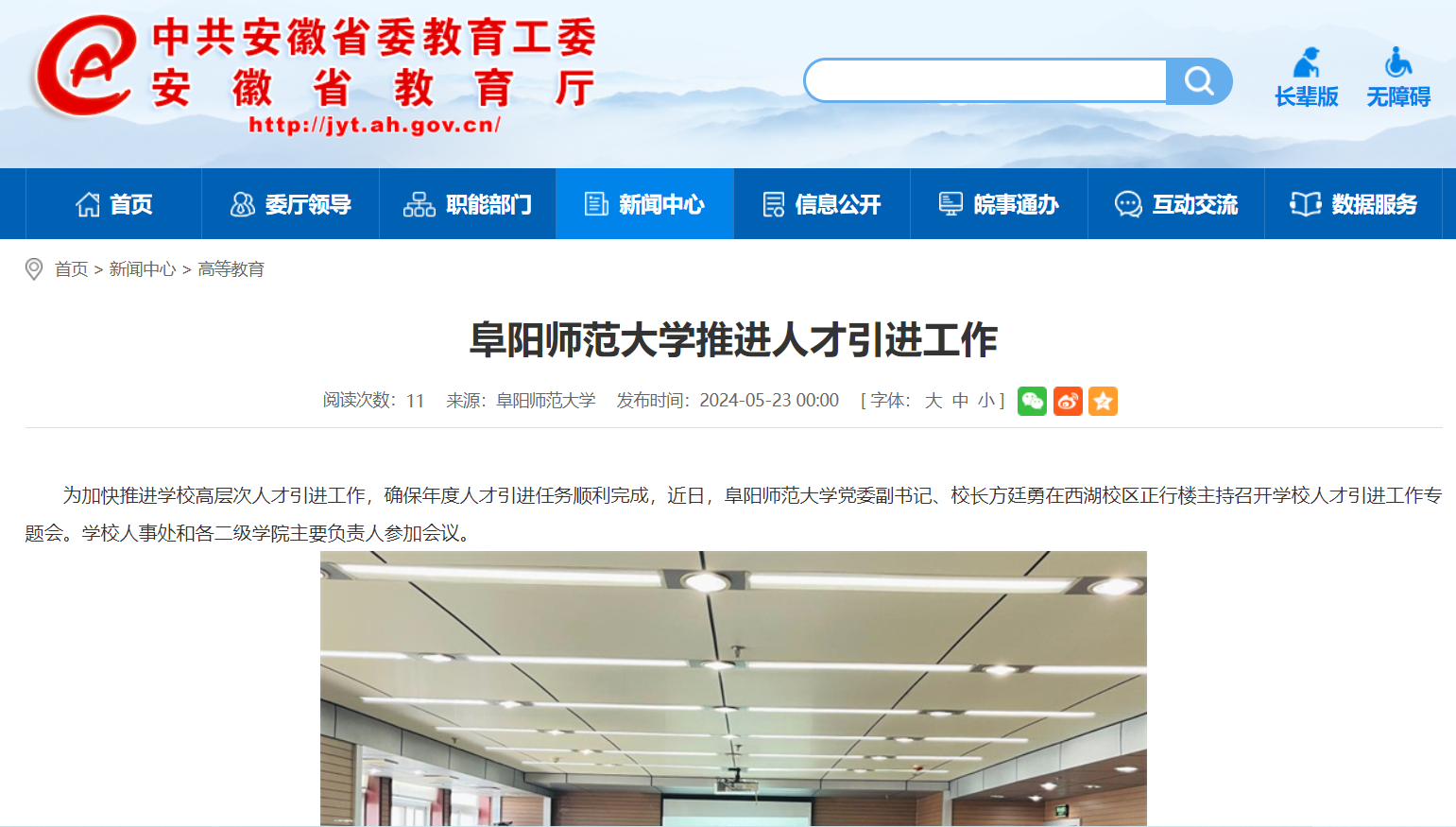 5月23日,安徽教育网报道:阜阳师范大学推进人才引进工作。文章地址: