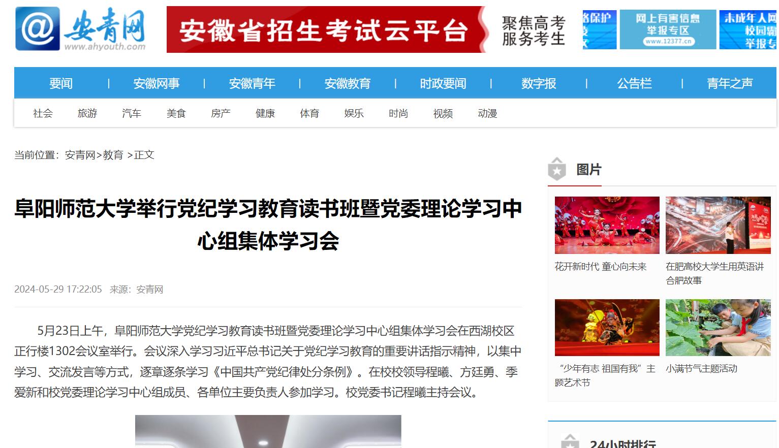 5月29日,安青网报道:阜阳师范大学举行党纪学习教育读书班暨党委理论学习中心组集体学习会。文章地址:https://www.ahyouth.com/news/20240529/1734151.shtml