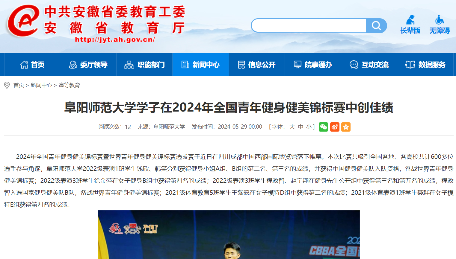 5月29日,安徽教育网报道:阜阳师范大学学子在2024年全国青年健身健美锦标赛中创佳绩。文章地址: