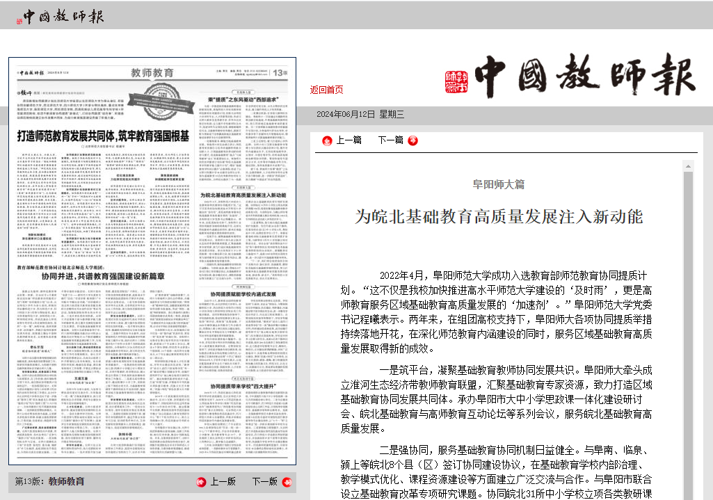6月12日,中国教师报报道:阜阳师大篇:为皖北基础教育高质量发展注入新动能。文章地址:http://paper.chinateacher.com.cn/zgjsb/html/2024-06/12/content_640489.htm?div=-1