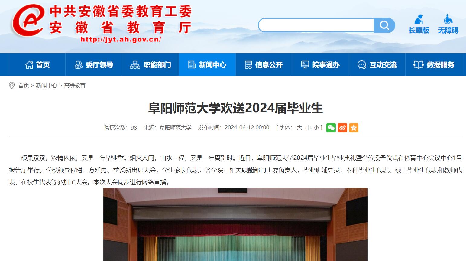 6月12日,安徽教育网报道:阜阳师范大学欢送2024届毕业生。文章地址: