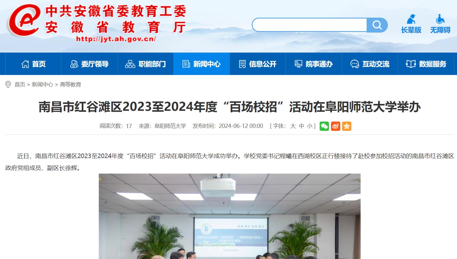 6月12日,安徽教育网报道:南昌市红谷滩区2023至2024年度“百场校招”活动在阜阳师范大学举办。文章地址: