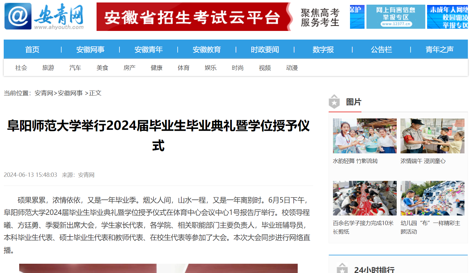 6月13日,安青网报道:阜阳师范大学举行2024届毕业生毕业典礼暨学位授予仪式。文章地址: