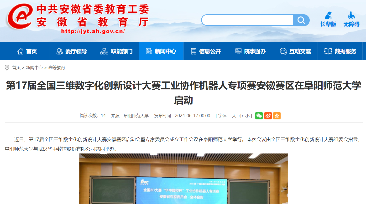 6月17日,安徽教育网报道:第17届全国三维数字化创新设计大赛工业协作机器人专项赛安徽赛区在阜阳师范大学启动。文章地址:http://jyt.ah.gov.cn/xwzx/gdjy/40709663.html