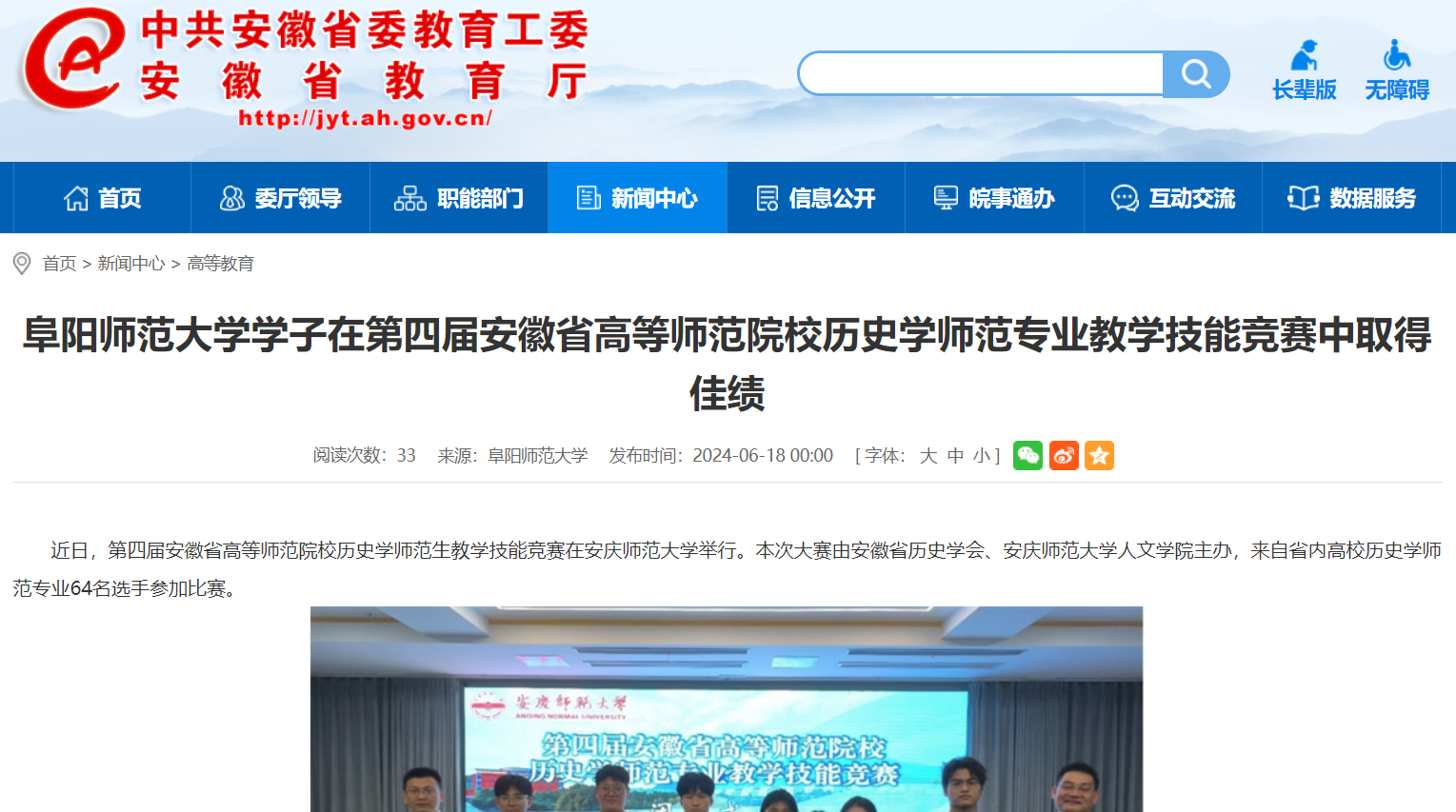 6月18日,安徽教育网报道:阜阳师范大学学子在第四届安徽省高等师范院校历史学师范专业教学技能竞赛中取得佳绩。文章地址:http://jyt.ah.gov.cn/xwzx/gdjy/40709891.html