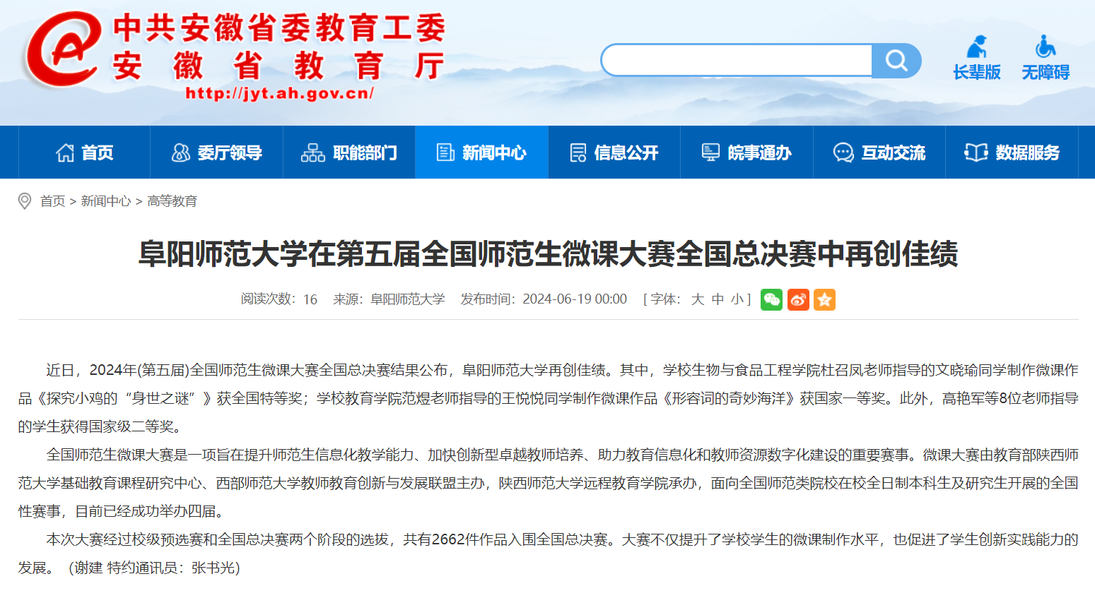 6月19日,安徽教育网报道:阜阳师范大学在第五届全国师范生微课大赛全国总决赛中再创佳绩。文章地址: