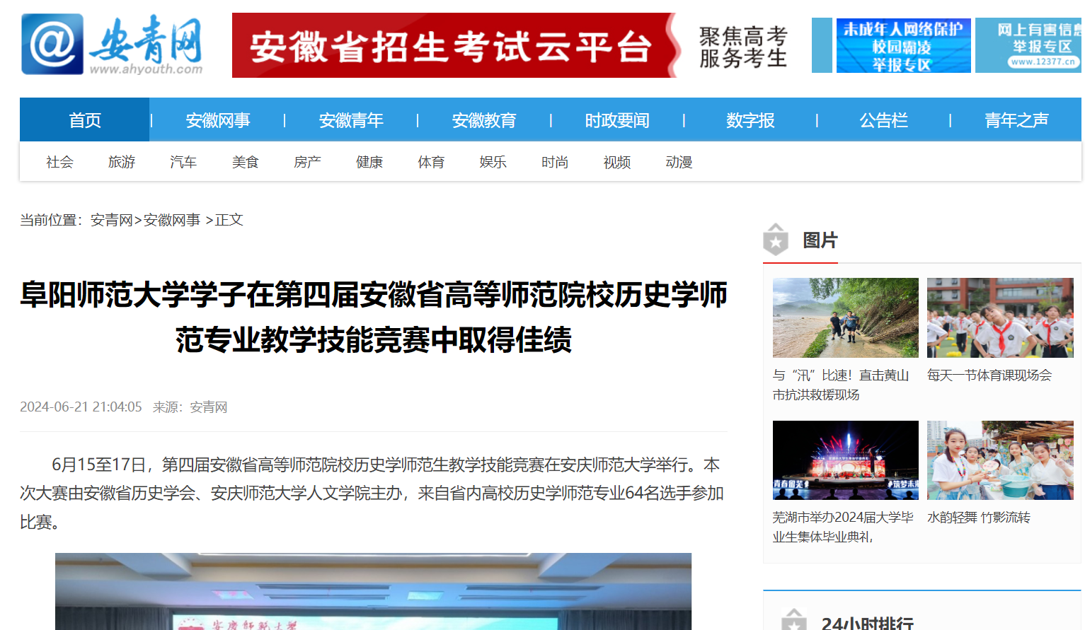 6月21日,安青网报道:阜阳师范大学学子在第四届安徽省高等师范院校历史学师范专业教学技能竞赛中取得佳绩。文章地址:https://www.ahyouth.com/news/20240621/1736026.shtml