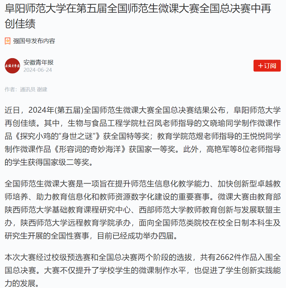 6月24日,“学习强国”安徽青年报平台报道:阜阳师范大学在第五届全国师范生微课大赛全国总决赛中再创佳绩。文章地址:https://article.xuexi.cn/articles/index.html?art_id=9672511685246348646&source=share&study_style_id=feeds_opaque&reco_id=102b19ba1eedc0a8223e0009&share_to=wx_single&study_share_enable=1&study_comment_disable=0&ptype=0&item_id=9672511685246348646