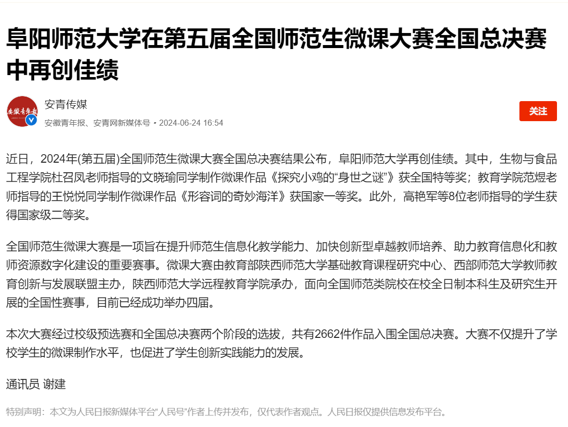 人民日报客户端报道:阜阳师范大学在第五届全国师范生微课大赛全国总决赛中再创佳绩