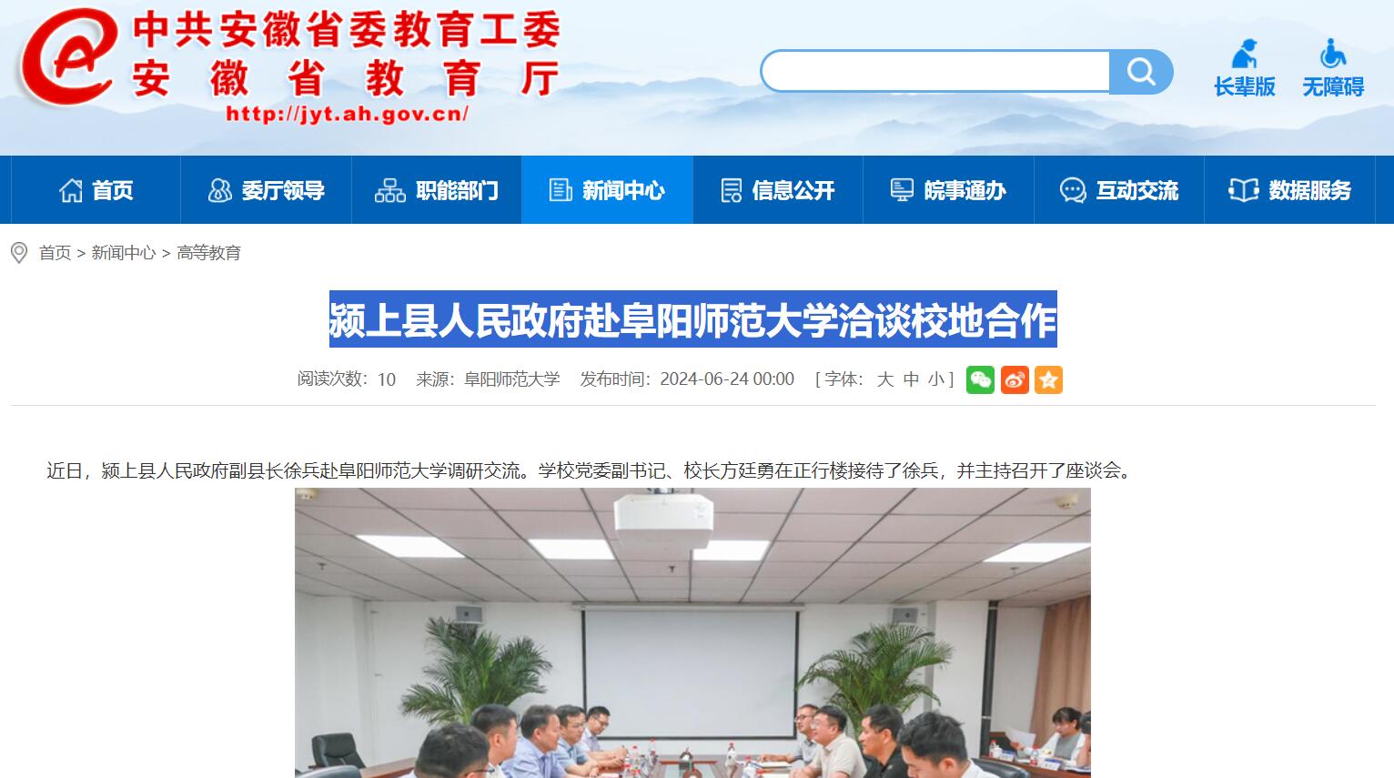 6月24日,安徽教育网报道:颍上县人民政府赴阜阳师范大学洽谈校地合作。文章地址: