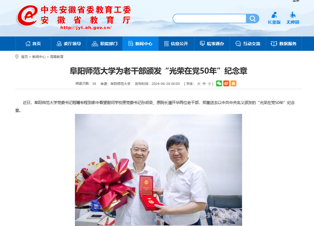 6月28日,安徽教育网报道:阜阳师范大学为老干部颁发“光荣在党50年”纪念章。文章地址: