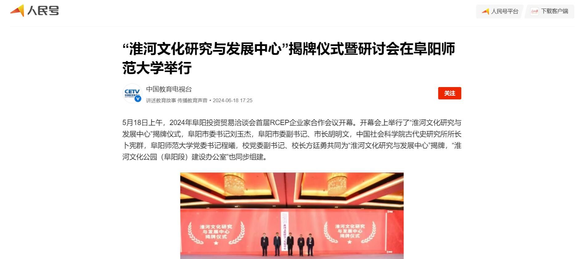 6月18日,人民日报客户端报道:“淮河文化研究与发展中心”揭牌仪式暨研讨会在阜阳师范大学举行。文章地址:https://www.peopleapp.com/rmharticle/30045414075