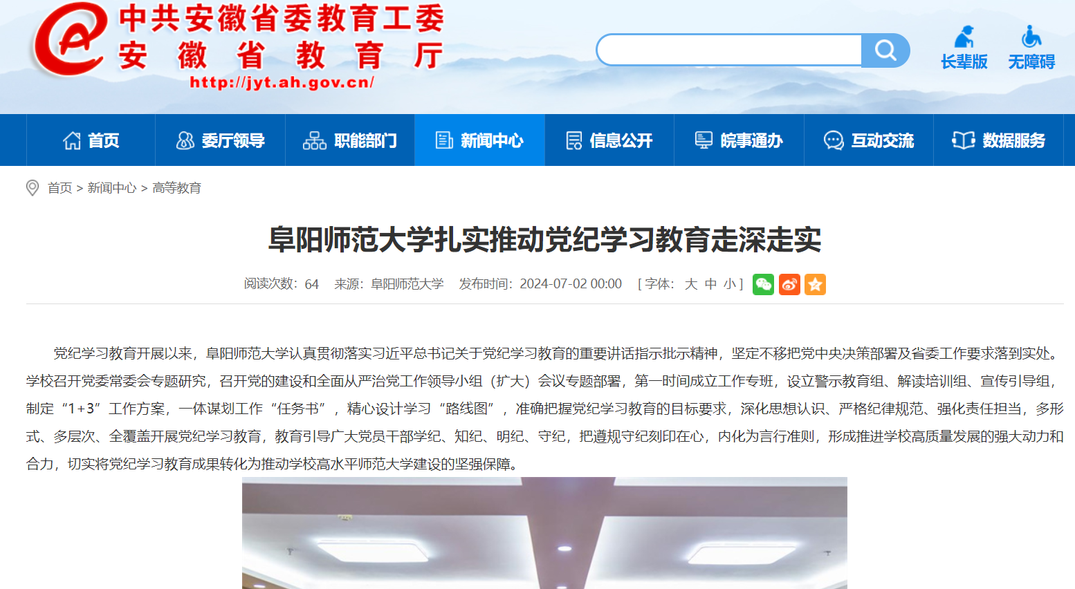7月02日,安徽教育网报道:阜阳师范大学扎实推动党纪学习教育走深走实。文章地址: