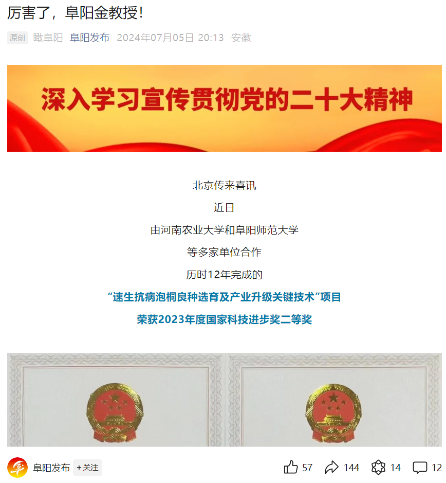 7月05日,阜阳发布报道:厉害了,阜阳金教授。文章地址: