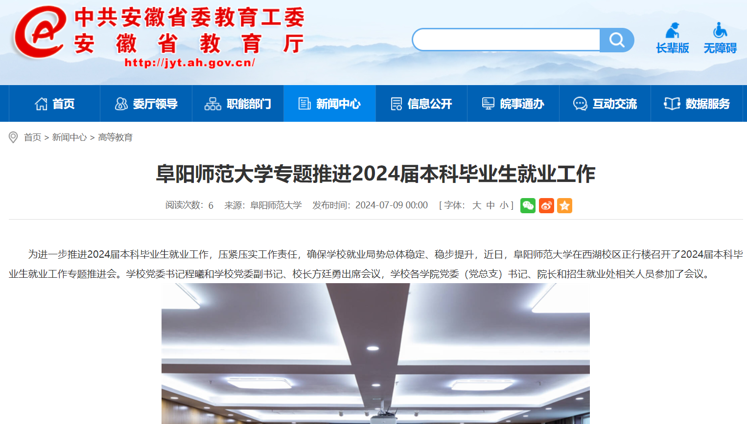 7月09日,安徽教育网报道:阜阳师范大学专题推进2024届本科毕业生就业工作。文章地址: