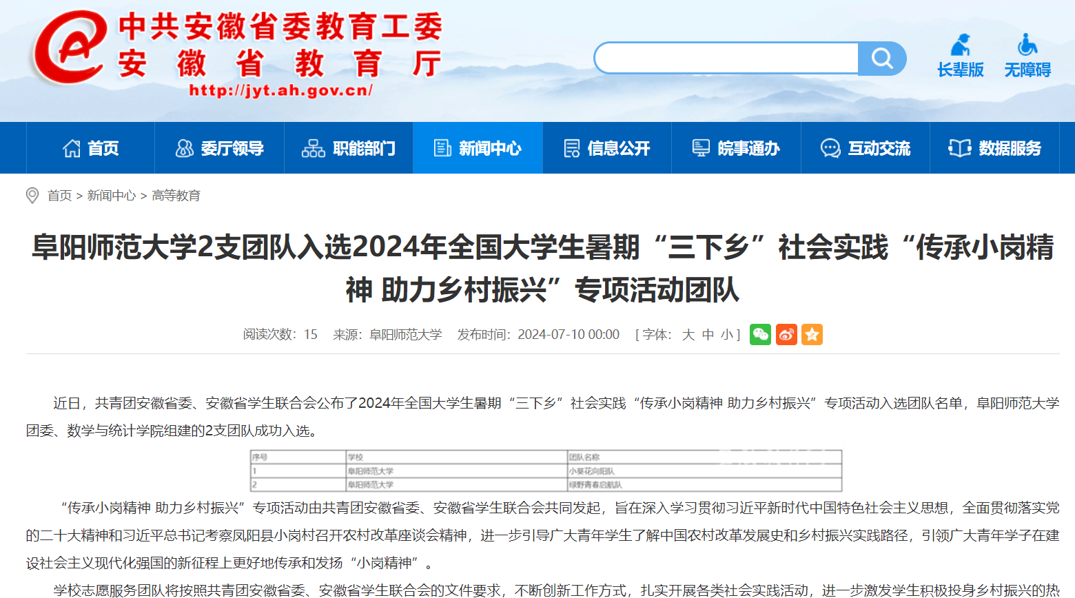 7月10日,安徽教育网报道:阜阳师范大学2支团队入选2024年全国大学生暑期“三下乡”社会实践“传承小岗精神 助力乡村振兴”专项活动团队。文章地址:http://jyt.ah.gov.cn/xwzx/gdjy/40712945.html