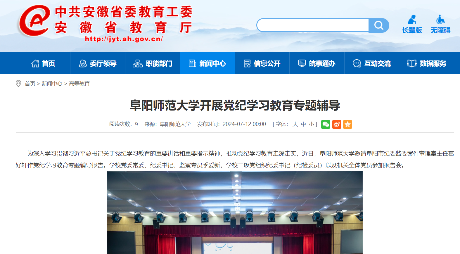 7月12日,安徽教育网报道:阜阳师范大学开展党纪学习教育专题辅导。文章地址: