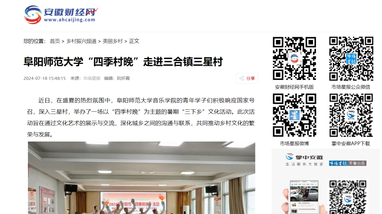 7月18日,安徽财经网报道:阜阳师范大学“四季村晚”走进三合镇三星村。文章地址: